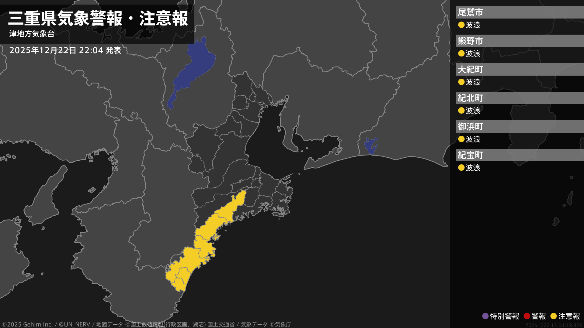【三重県 気象警報・注意報 2025年12月22日 22:04】南部では、23日朝から高波に注意してください。#気象警報注意報 #三重県