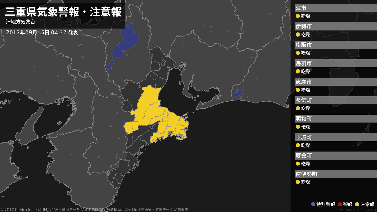 【三重県 気象警報・注意報 2017年09月15日 04:40】三重県では、15日まで空気の乾燥による火の取り扱いに注意してください。#気象警報注意報 #三重県