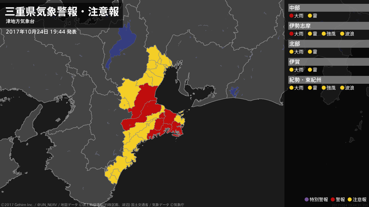 【三重県 気象警報 2017年10月24日 19:44】三重県では、25日朝まで土砂災害に警戒してください。#気象警報 #気象警報注意報 #三重県