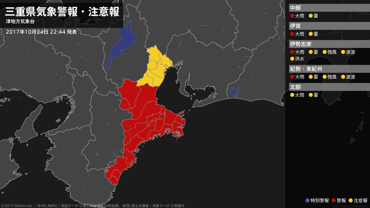 【三重県 気象警報・注意報 2017年10月24日 22:44】三重県では、25日朝まで土砂災害に警戒してください。#気象警報注意報 #三重県