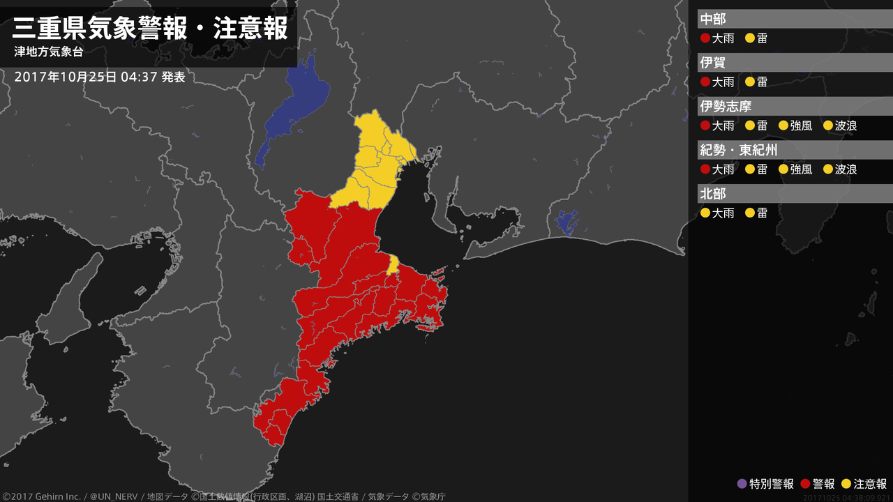 【三重県 気象警報・注意報 2017年10月25日 04:38】三重県では、25日昼前まで土砂災害に警戒してください。#気象警報注意報 #三重県