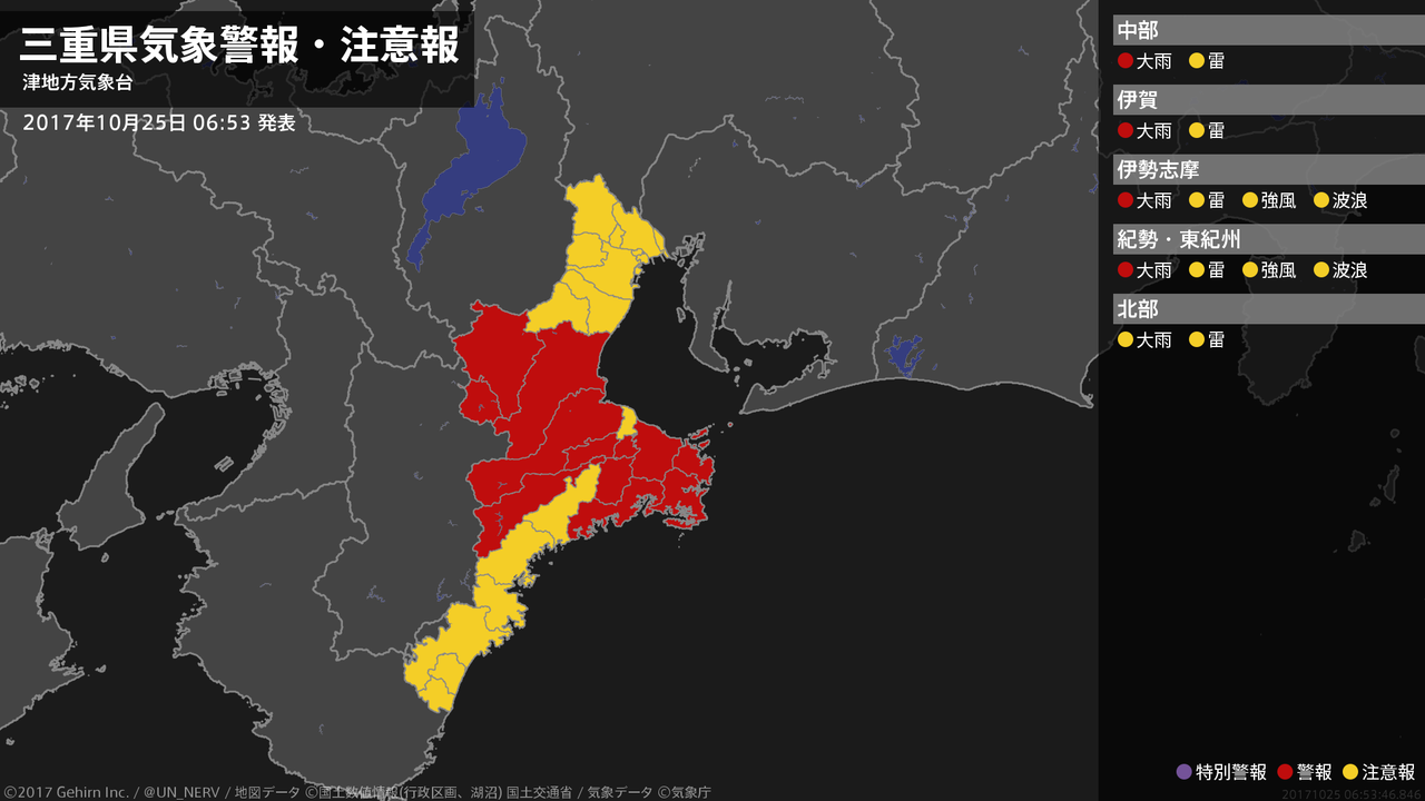 【三重県 気象警報・注意報 2017年10月25日 06:53】三重県では、25日昼前まで土砂災害に警戒してください。#気象警報注意報 #三重県
