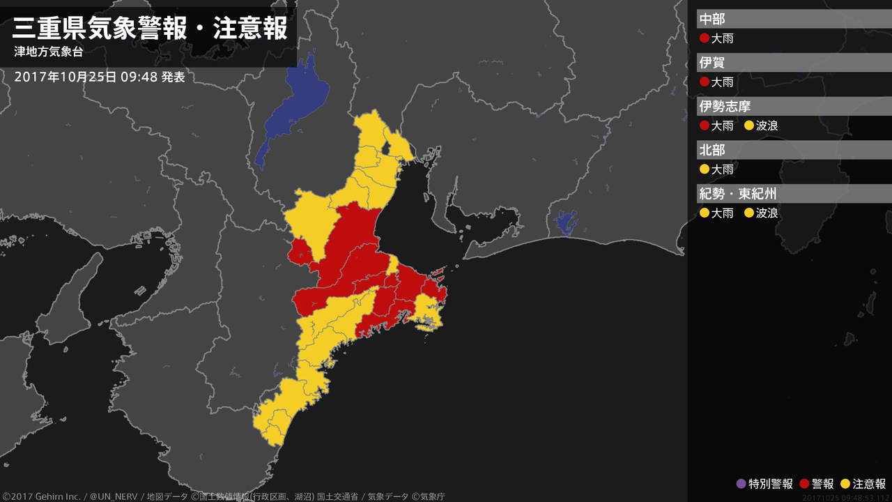 【三重県 気象警報 2017年10月25日 09:48】三重県では、25日昼前まで土砂災害に警戒してください。#気象警報 #気象警報注意報 #三重県