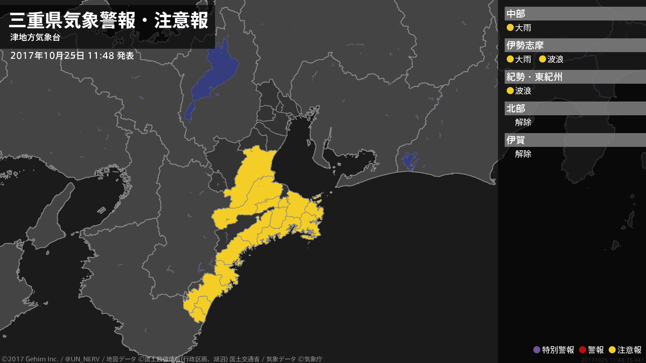 【三重県 気象警報(解除) 2017年10月25日 11:48】三重県に発表されていた気象警報はすべて解除されました。三重県では、25日夕方まで土砂災害に注意してください。南部では、25日夕方まで高波に注意してください。#気象警報 #三重県