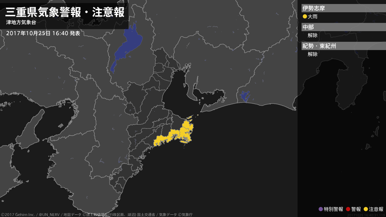 【三重県 土砂災害警戒情報 2017年10月25日 06:16】三重県に発表されていた土砂災害警戒情報はすべて解除されました。#土砂災害警戒情報 #三重県