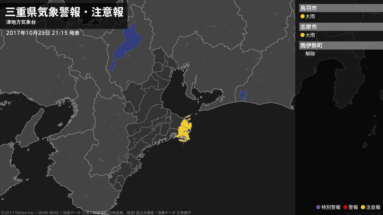 【三重県 気象警報 2017年10月24日 21:27】三重県では、25日朝まで土砂災害に警戒してください。#気象警報 #気象警報注意報 #三重県