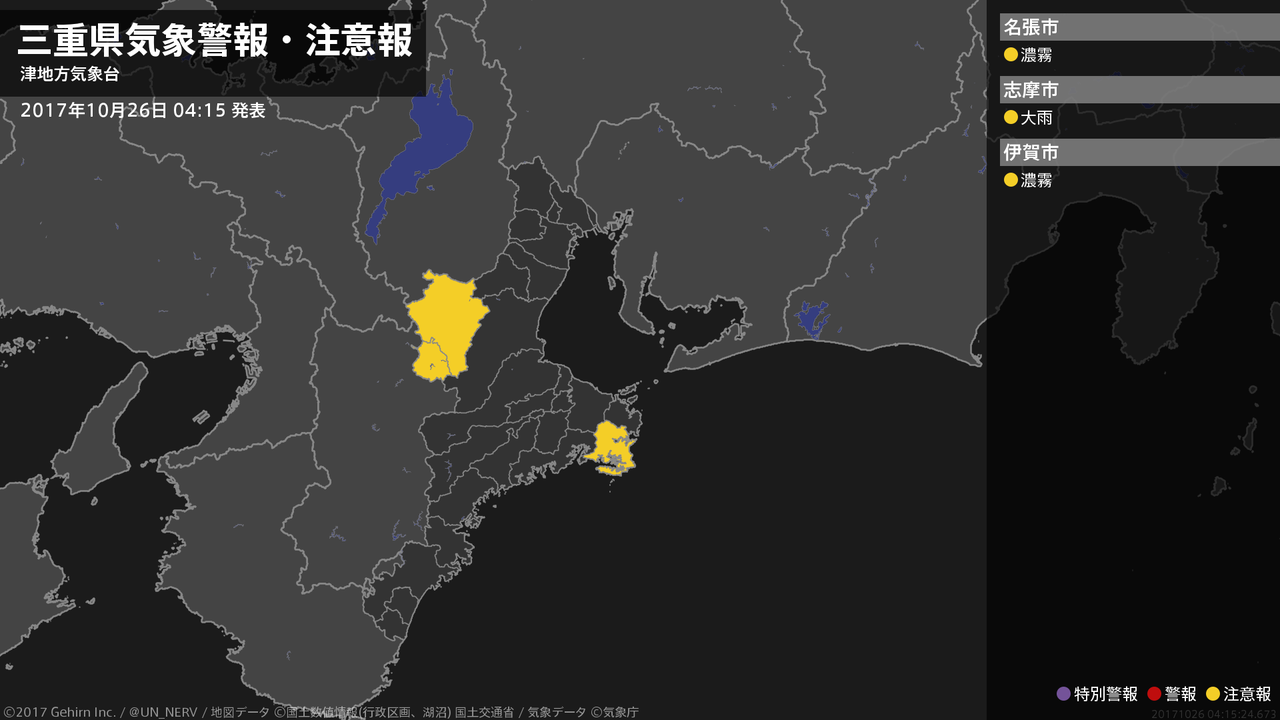 【三重県 気象警報・注意報 2017年10月26日 04:15】南部では、26日朝まで土砂災害に注意してください。北中部では、26日昼前まで濃霧による視程障害に注意してください。#気象警報注意報 #三重県