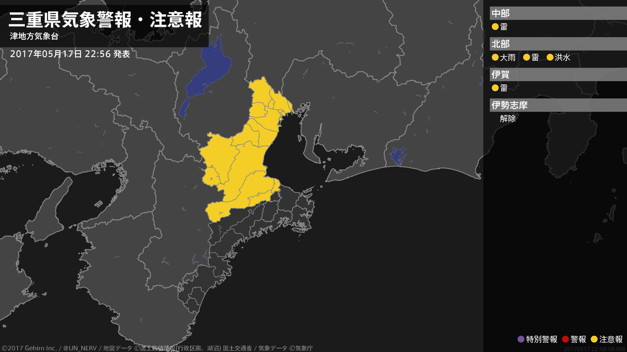 【三重県 気象警報・注意報 2017年05月17日 22:58】北中部では、18日朝まで低い土地の浸水や河川の増水、落雷に注意してください。#気象警報注意報 #三重県