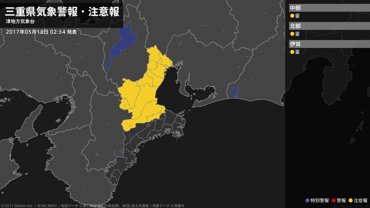 【三重県 気象警報・注意報 2017年05月18日 02:36】北中部では、18日朝まで急な強い雨や落雷に注意してください。#気象警報注意報 #三重県