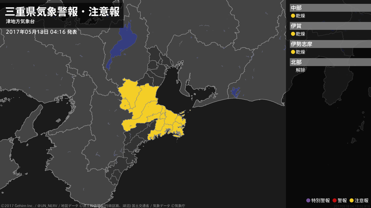 【三重県 気象警報・注意報 2017年05月14日 07:52】注意報を解除します。#気象警報注意報 #三重県