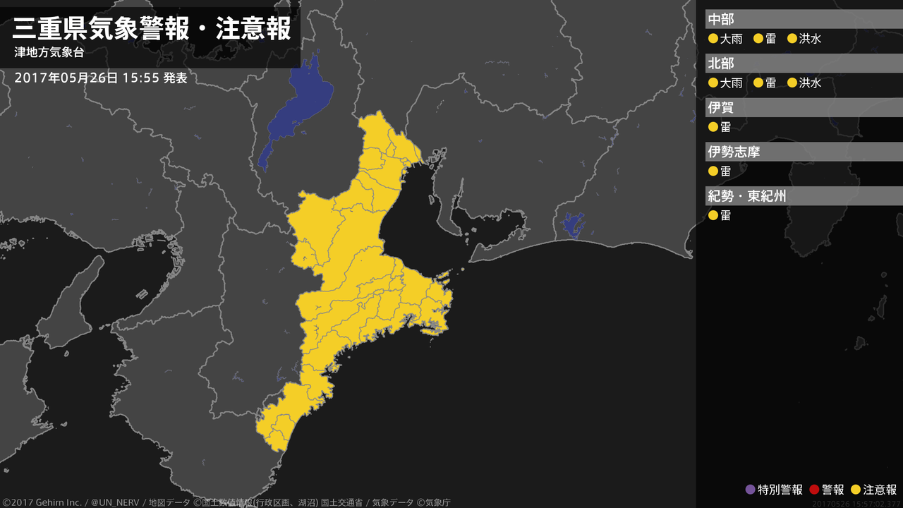 【三重県 気象警報・注意報 2017年05月26日 15:57】北中部では、26日夜のはじめ頃まで低い土地の浸水や河川の増水に注意してください。三重県では、26日夜のはじめ頃まで落雷に注意してください。#気象警報注意報 #三重県