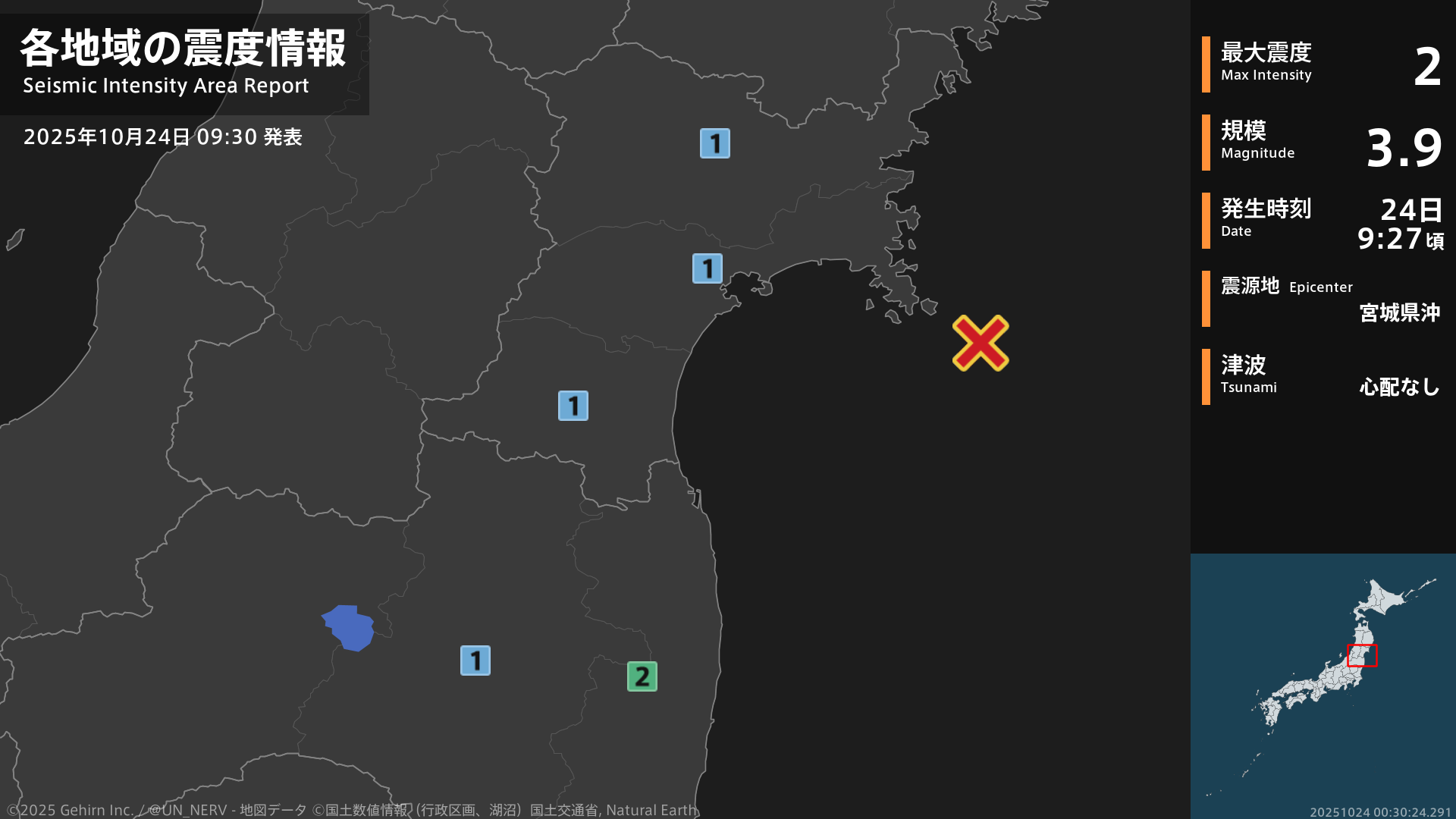 9時27分頃、宮城県沖を震源とする地震がありました。震源の深さは約50km、地震の規模はM3.9、最大震度2を福島県で観測しています。この地震による津波の心配はありません。