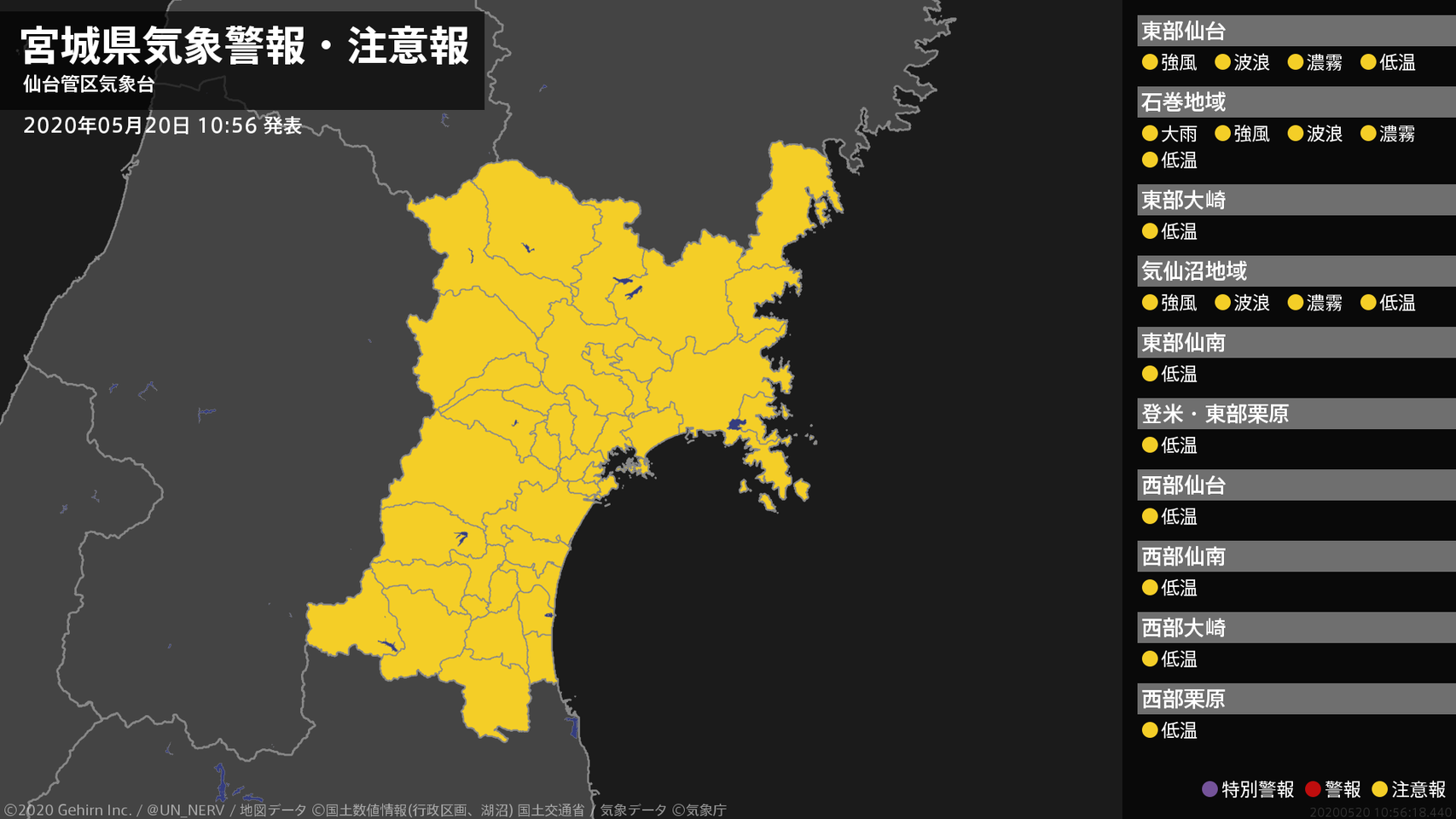 【宮城県 気象警報・注意報 2020年05月20日 10:56】東部では、土砂災害や強風、高波、濃霧による視程障害に注意してください。宮城県では、低温に注意してください。#気象警報注意報 #宮城県