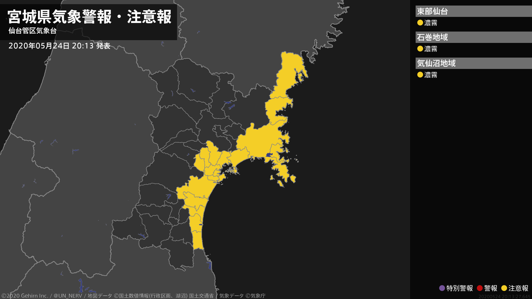【宮城県 気象警報・注意報 2020年05月24日 20:13】東部では、24日夜遅くから25日昼前まで濃霧による視程障害に注意してください。#気象警報注意報 #宮城県
