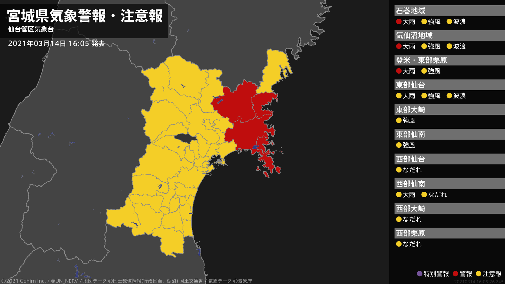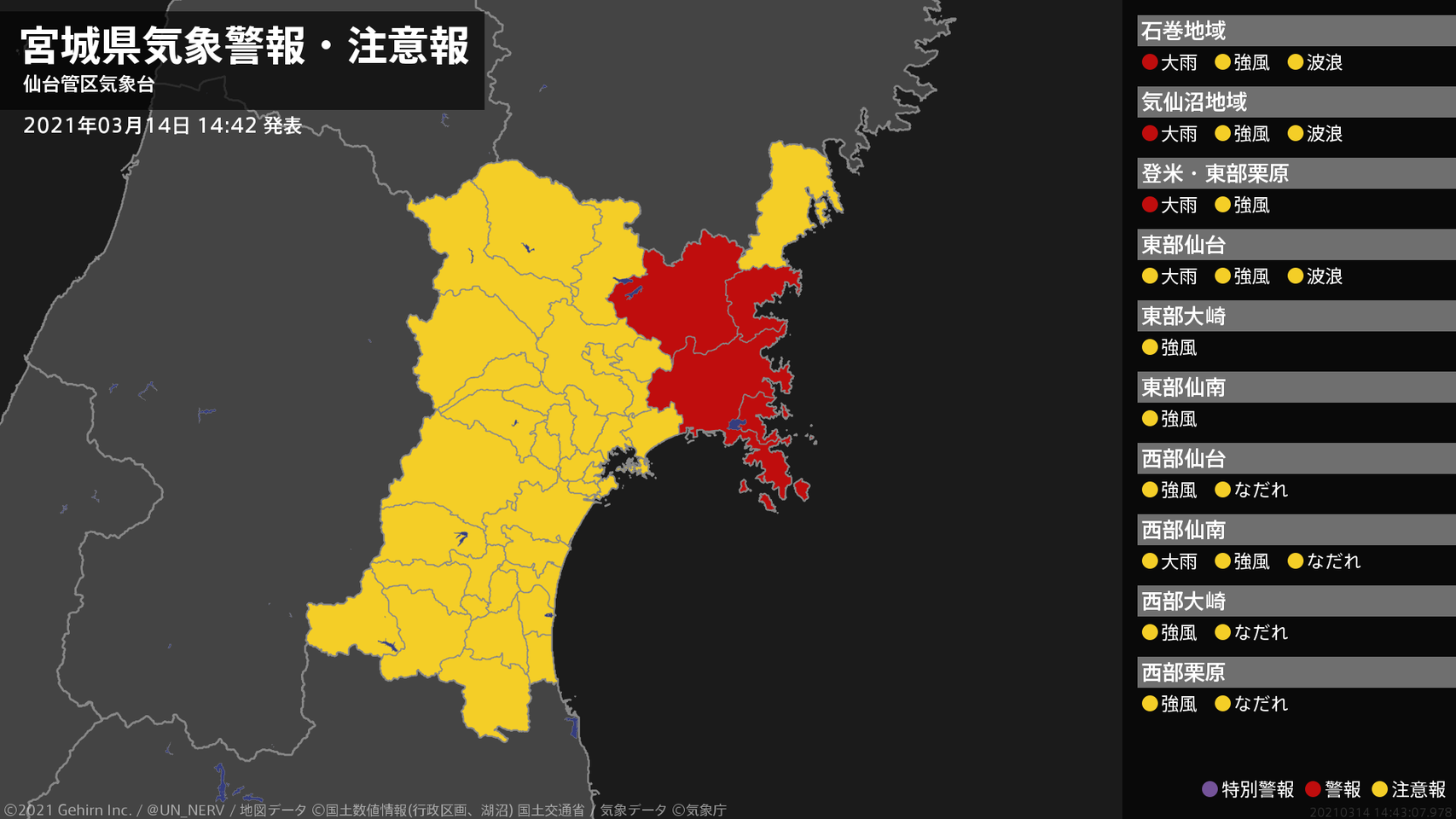 【宮城県 気象警報・注意報 2021年03月14日 14:43】東部では、14日夜のはじめ頃まで土砂災害に警戒してください。#気象警報注意報 #宮城県