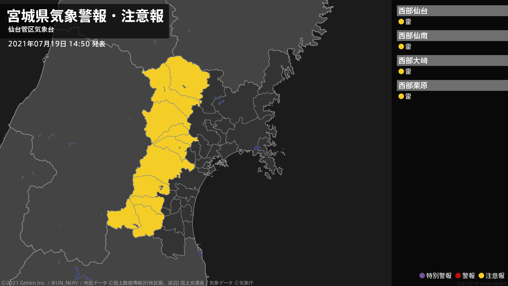 【宮城県 気象警報・注意報 2021年07月19日 14:50】