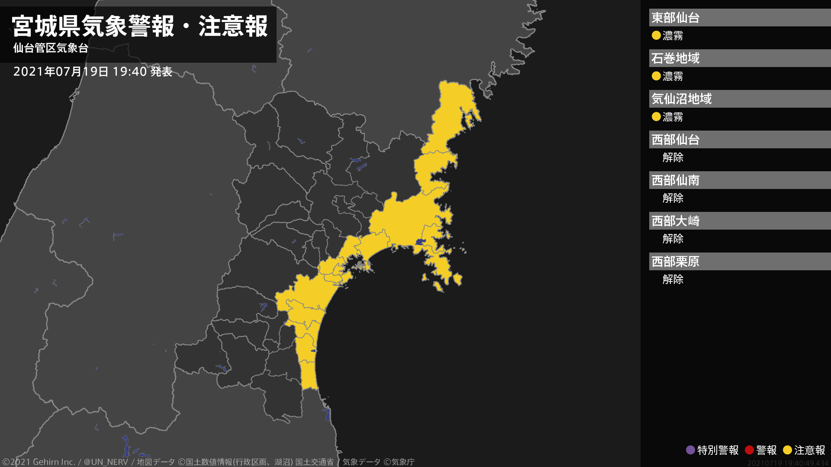 【宮城県 気象警報・注意報 2021年07月19日 19:40】