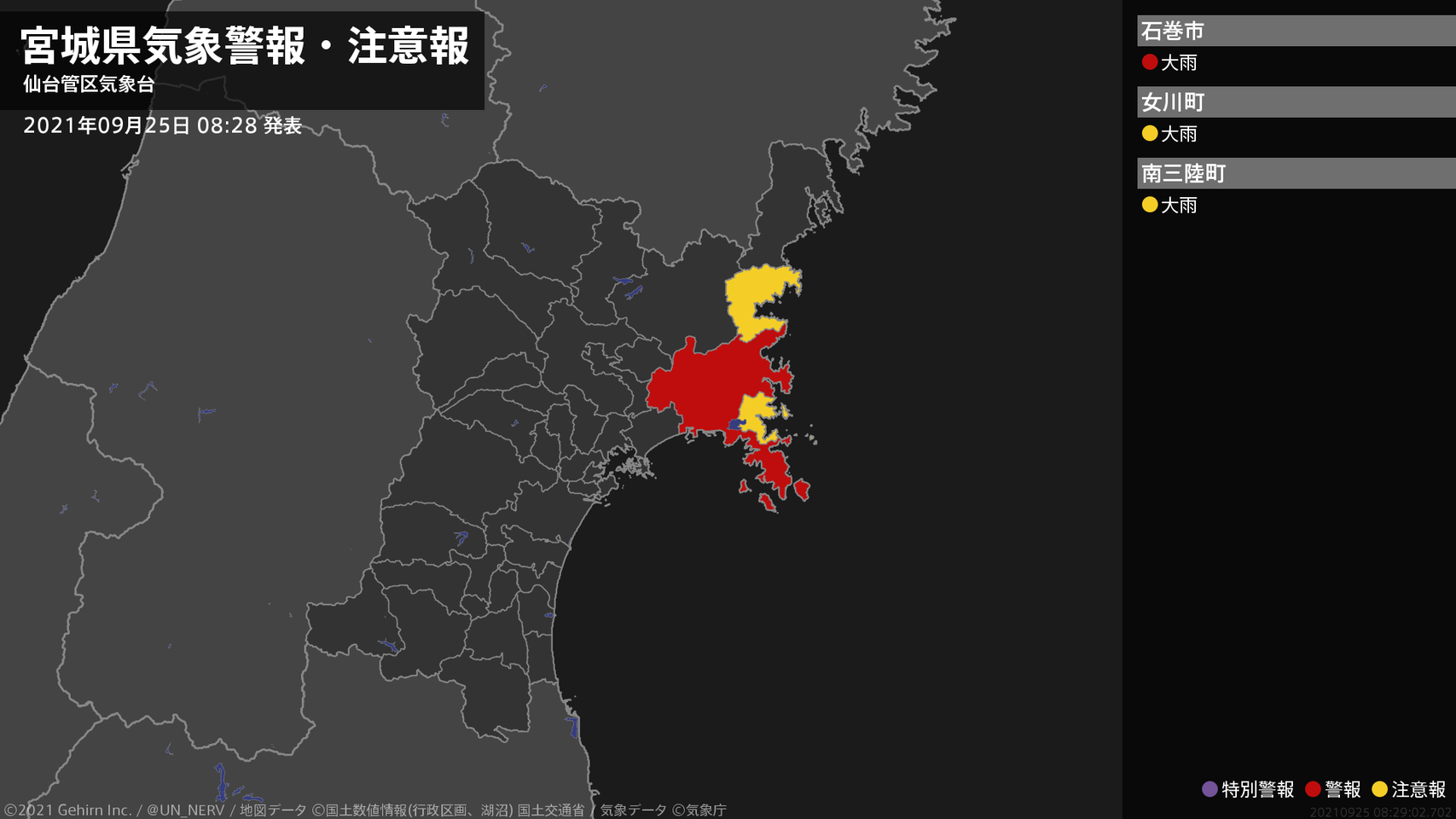 【宮城県 気象警報 2021年09月25日 02:19】東部では、25日朝まで土砂災害に警戒してください。#気象警報 #気象警報注意報 #宮城県