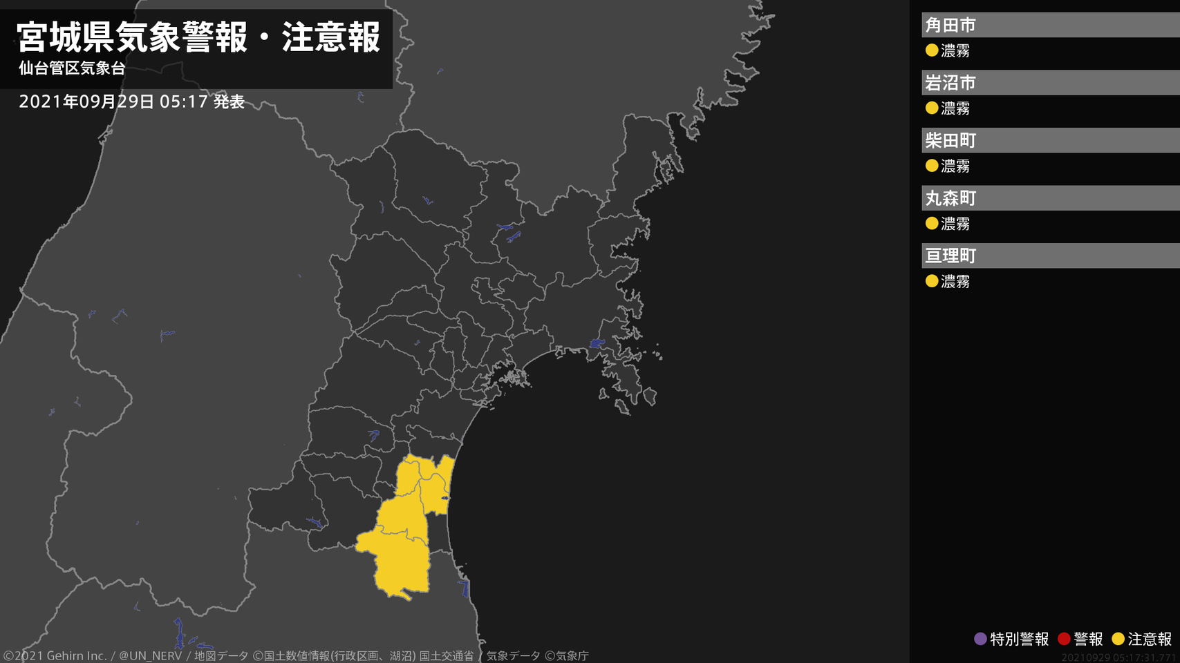 【宮城県 気象警報・注意報 2021年09月29日 05:17】東部では、29日昼前まで濃霧による視程障害に注意してください。#気象警報注意報 #宮城県