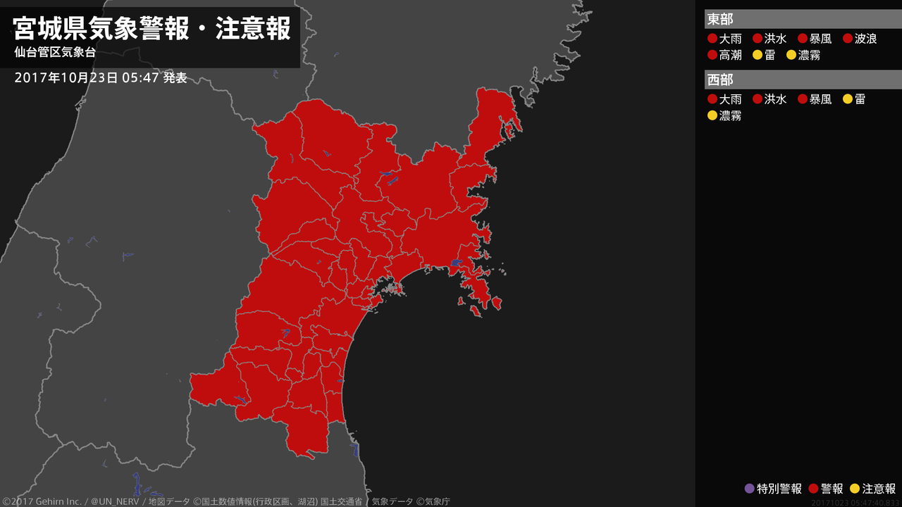 【宮城県 気象警報・注意報 2017年10月23日 05:47】宮城県では、土砂災害や低い土地の浸水、河川の増水、暴風、高波、高潮に警戒してください。#気象警報注意報 #宮城県