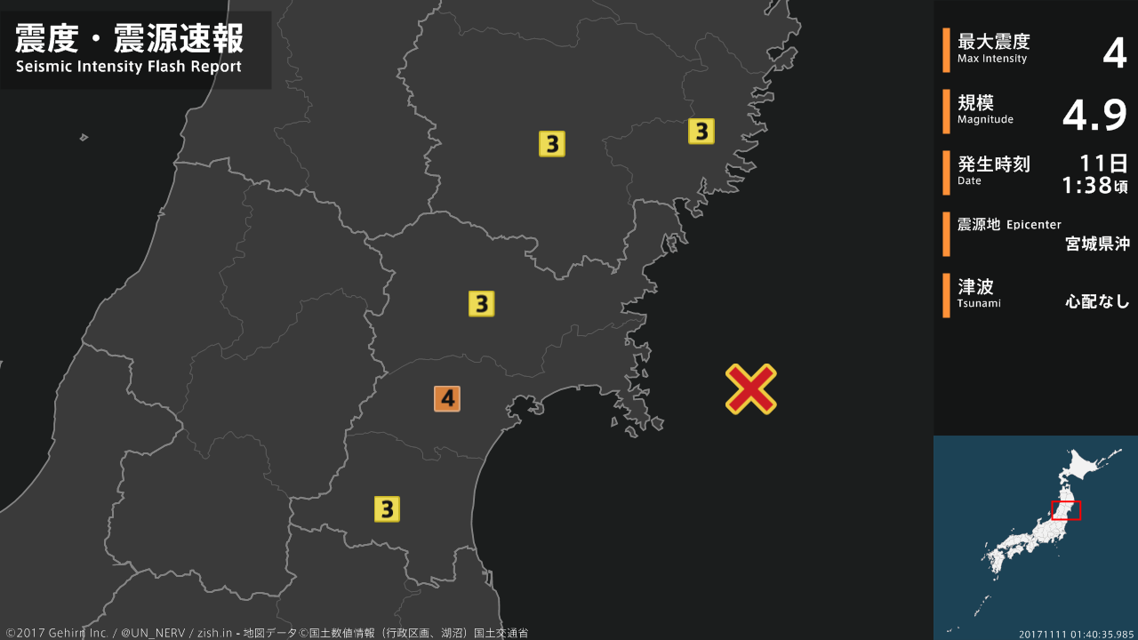 11日01時38分頃、宮城県沖を震源とする地震がありました。震源の深さは約60km、地震の規模はM4.9と推定されています。この地震による津波の心配はありません。