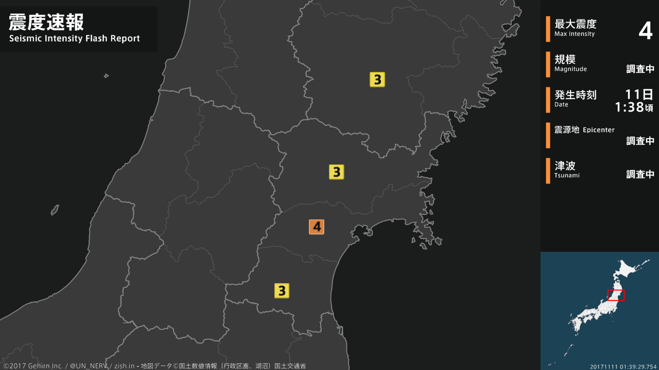【震度・震源速報 2017年11月11日】