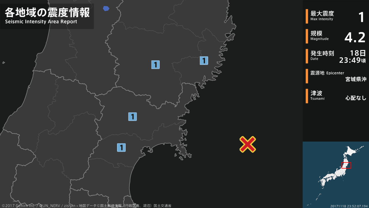 【地震情報 2017年11月18日】23時49分頃、宮城県沖を震源とする地震がありました。震源の深さは約30km、地震の規模はM4.2、最大震度1を岩手県、宮城県で観測しています。この地震による津波の心配はありません。#地震 #岩手県 #宮城県