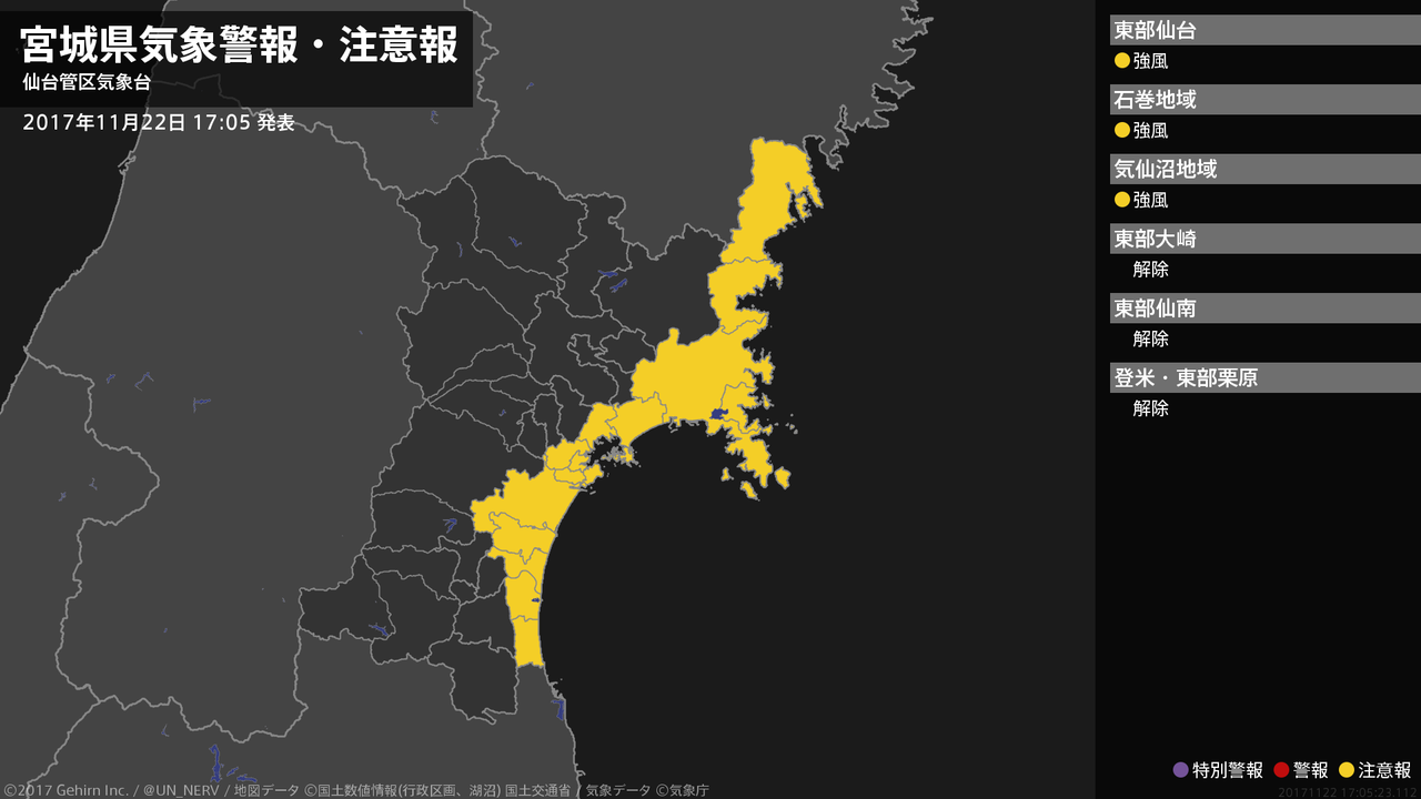 【宮城県 気象警報・注意報 2017年11月22日 17:05】東部では、23日明け方まで強風に注意してください。#気象警報注意報 #宮城県