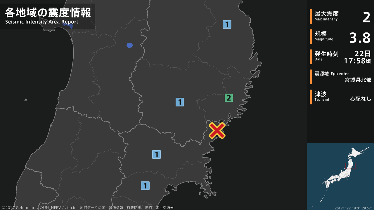 【地震情報 2017年11月22日】17時58分頃、宮城県北部を震源とする地震がありました。震源の深さは約70km、地震の規模はM3.8、最大震度2を岩手県で観測しています。この地震による津波の心配はありません。#地震 #岩手県 #宮城県