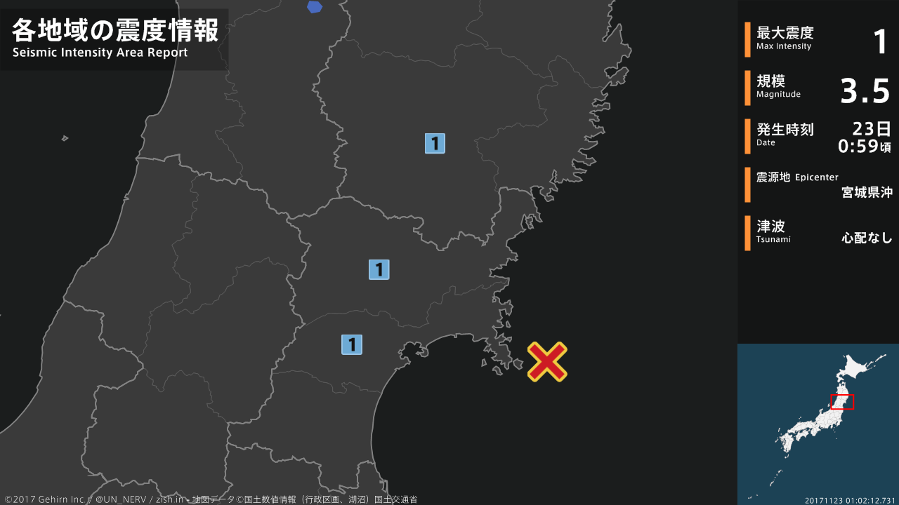 【地震情報 2017年11月23日】00時59分頃、宮城県沖を震源とする地震がありました。震源の深さは約50km、地震の規模はM3.5、最大震度1を岩手県、宮城県で観測しています。この地震による津波の心配はありません。#地震 #岩手県 #宮城県