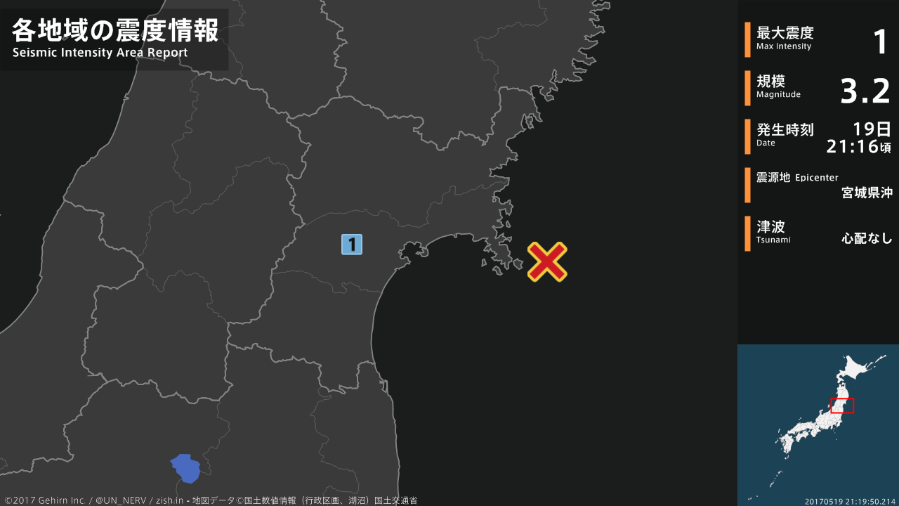 【地震情報 2017年5月19日】21時16分頃、宮城県沖を震源とする地震がありました。震源の深さは約50km、地震の規模はM3.2、最大震度1を宮城県で観測しています。この地震による津波の心配はありません。#地震 #宮城県