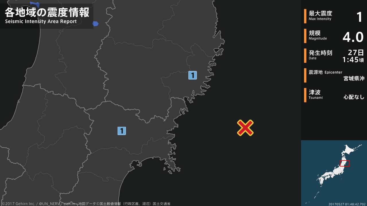 【地震情報 2017年5月27日】01時45分頃、宮城県沖を震源とする地震がありました。震源の深さは約40km、地震の規模はM4.0、最大震度1を岩手県、宮城県で観測しています。この地震による津波の心配はありません。#地震 #岩手県 #宮城県