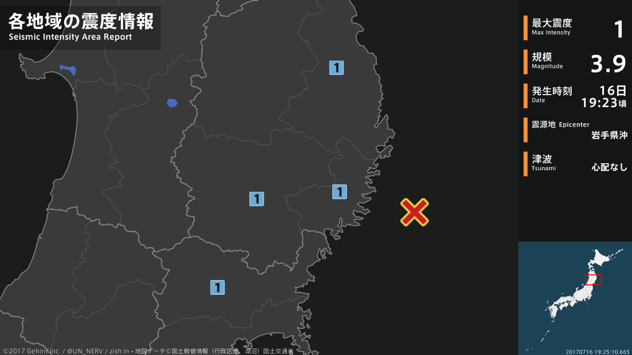 【地震情報 2017年7月16日】19時23分頃、岩手県沖を震源とする地震がありました。震源の深さは約40km、地震の規模はM3.9、最大震度1を岩手県、宮城県で観測しています。この地震による津波の心配はありません。#地震 #岩手県 #宮城県