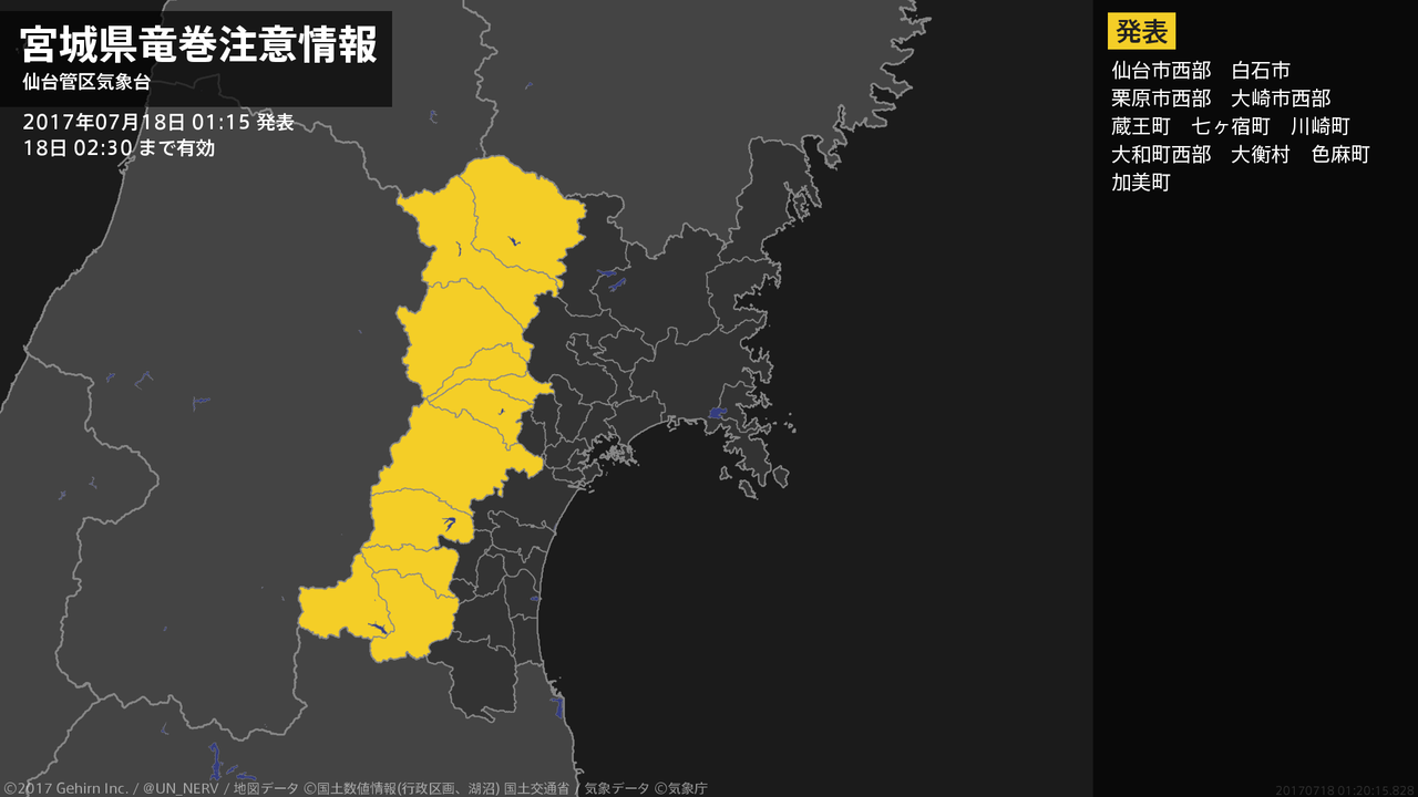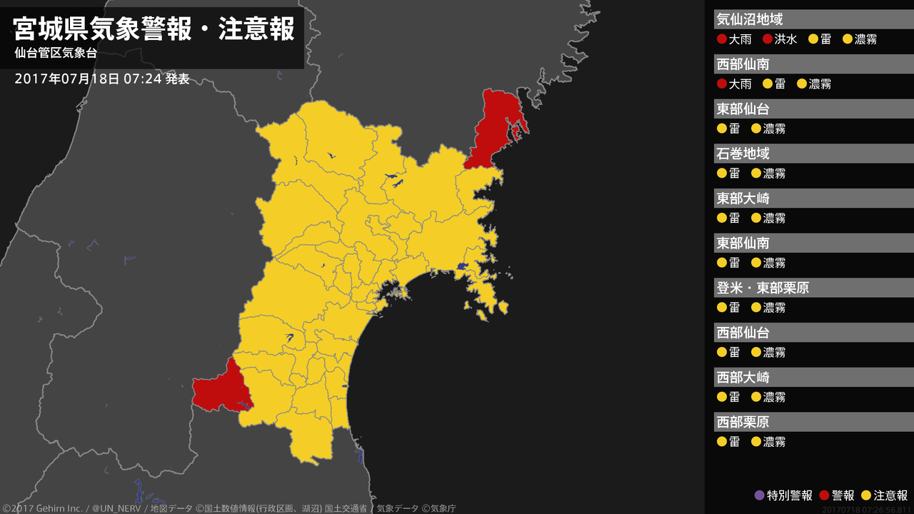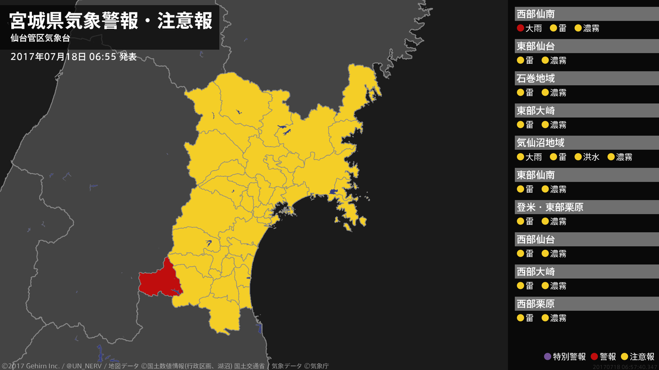 【宮城県 気象警報・注意報 2017年07月16日 17:30】西部では、16日夜遅くまで土砂災害や河川の増水に注意してください。宮城県では、16日夜のはじめ頃まで落雷に、16日夜遅くまで濃霧による視程障害に注意してください。#気象警報注意報 #宮城県