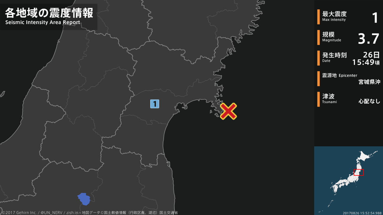 【地震情報 2017年8月26日】15時49分頃、宮城県沖を震源とする地震がありました。震源の深さは約60km、地震の規模はM3.7、最大震度1を宮城県で観測しています。この地震による津波の心配はありません。#地震 #宮城県