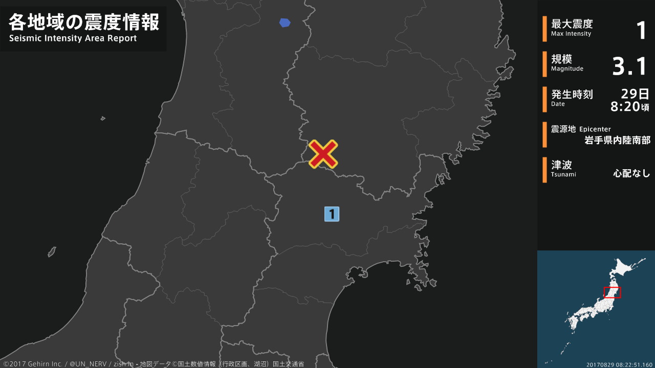 【地震情報 2017年8月29日】08時20分頃、岩手県内陸南部を震源とする地震がありました。震源の深さは約10km、地震の規模はM3.1、最大震度1を宮城県で観測しています。この地震による津波の心配はありません。#地震 #宮城県