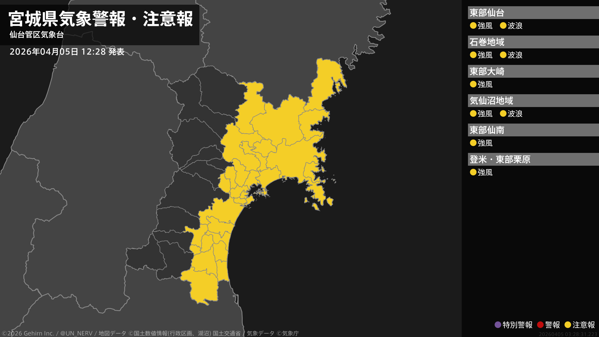 【宮城県 気象警報・注意報 2026年04月05日 12:28】東部では、5日夕方まで強風に、6日明け方まで高波に注意してください。#気象警報注意報 #宮城県