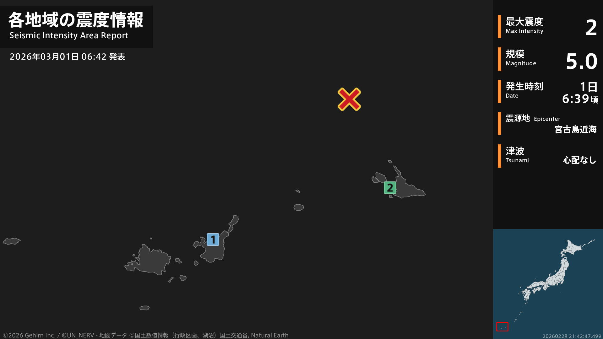 【地震情報 2026年3月1日】6時39分頃、宮古島近海を震源とする地震がありました。震源の深さは約10km、地震の規模はM5.0、最大震度2を沖縄県で観測しています。この地震による津波の心配はありません。#地震 #沖縄県