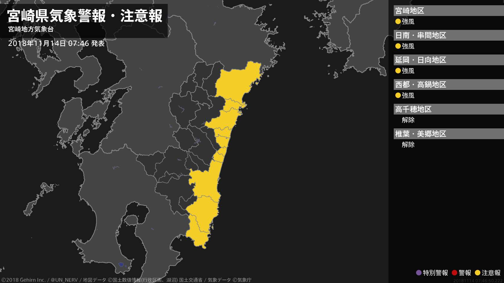 【宮崎県 気象警報・注意報 2018年11月14日 07:46】
