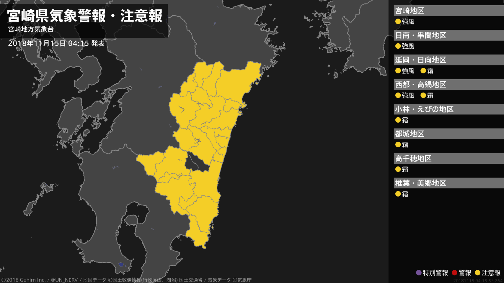 【宮崎県 気象警報・注意報 2018年11月15日 04:15】