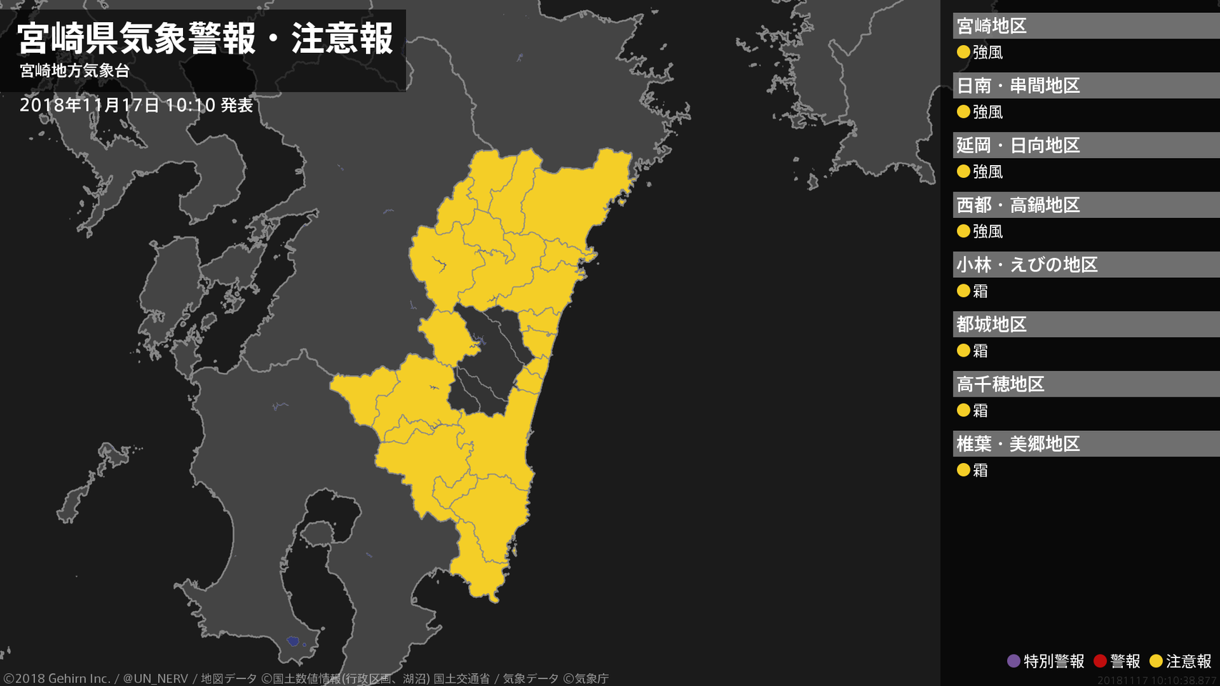 【宮崎県 気象警報・注意報 2018年11月15日 10:16】