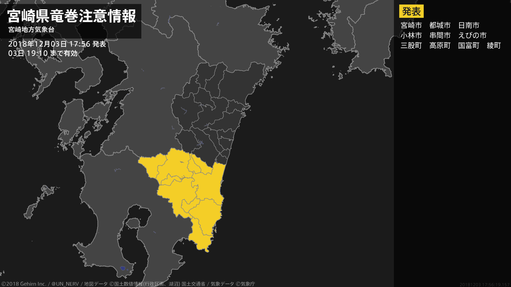 【宮崎県 気象警報(解除) 2018年12月03日 23:58】宮崎県に発表されていた気象警報はすべて解除されました。#気象警報 #宮崎県