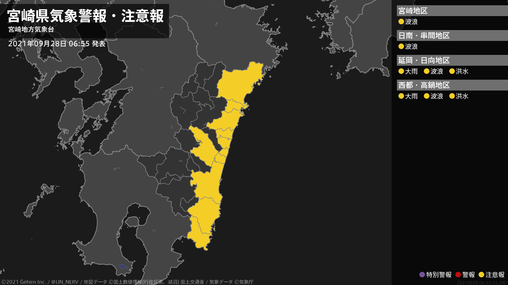 【宮崎県 気象警報・注意報 2021年09月28日 06:55】北部平野部では、低い土地の浸水や河川の増水に注意してください。南部平野部、北部平野部では、高波に注意してください。#気象警報注意報 #宮崎県
