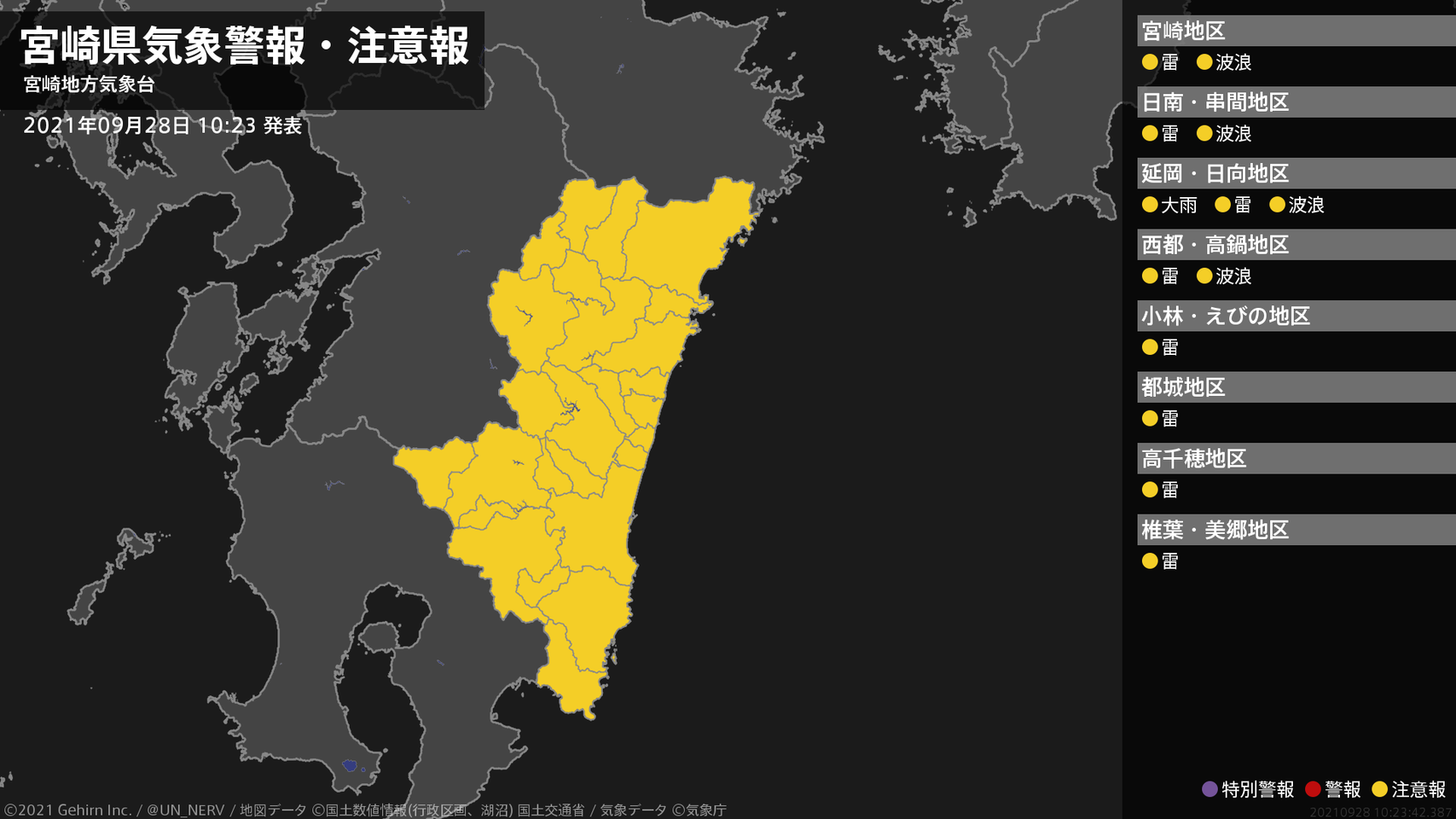 【宮崎県 気象警報・注意報 2021年09月28日 10:23】北部平野部では、低い土地の浸水に注意してください。南部平野部、北部平野部では、高波に注意してください。宮崎県では、落雷に注意してください。#気象警報注意報 #宮崎県