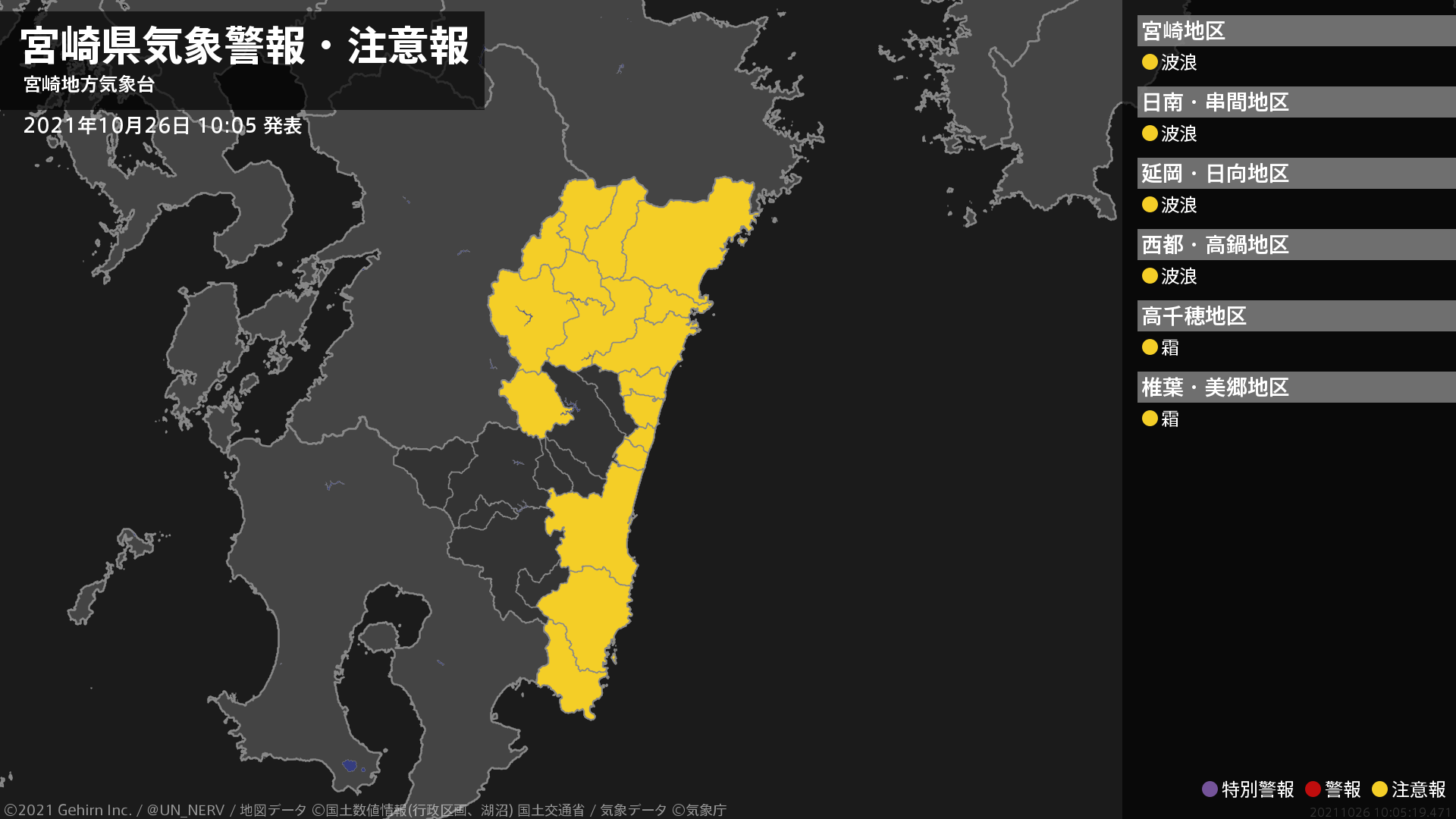 【宮崎県 気象警報・注意報 2021年10月26日 08:23】北部平野部では26日昼前まで、南部平野部では26日夕方まで、高波に注意してください。#気象警報注意報 #宮崎県