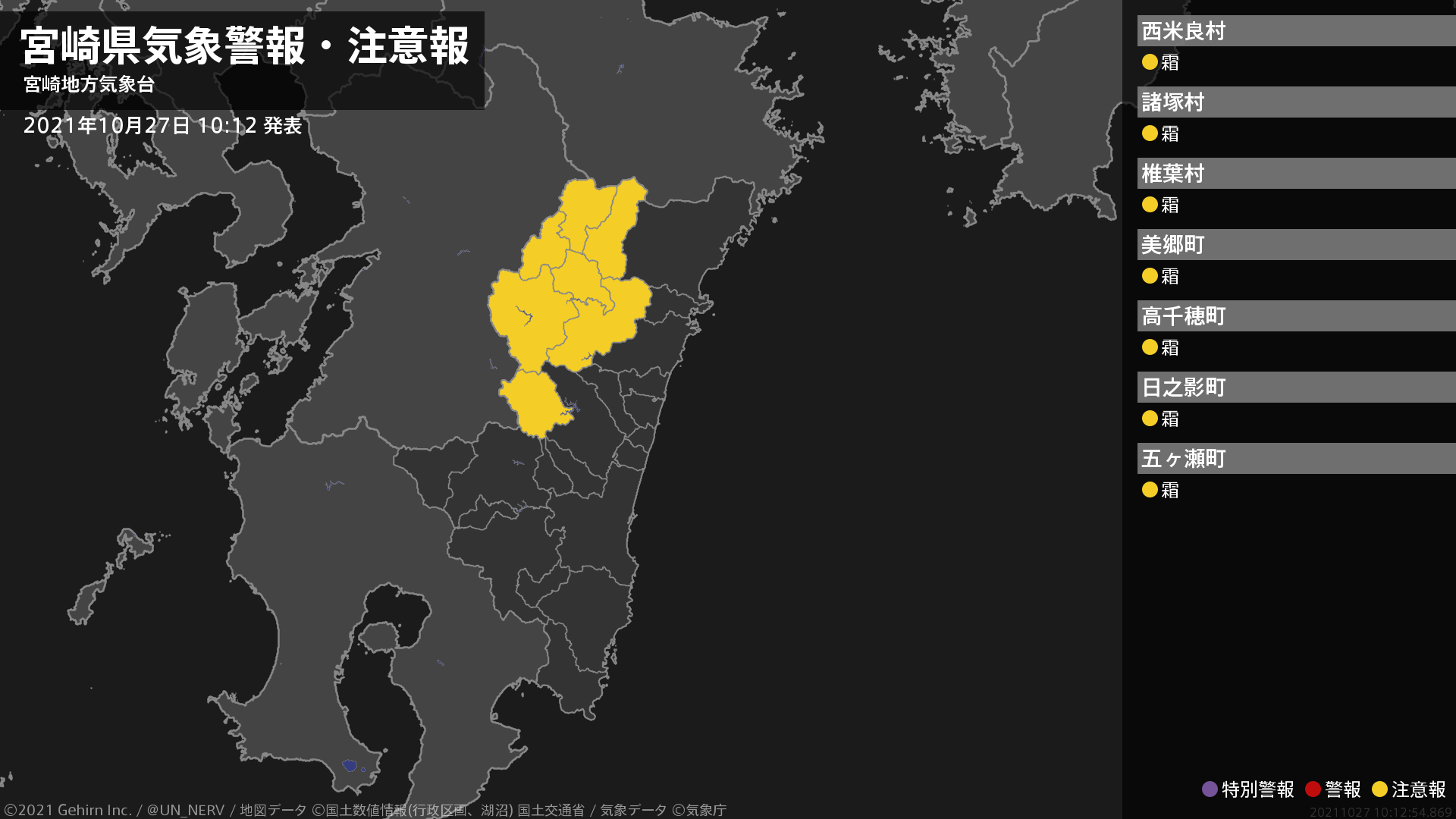 【宮崎県 気象警報・注意報 2021年10月27日 10:12】北部山沿いでは、28日朝は霜に対する農作物の管理に注意してください。#気象警報注意報 #宮崎県
