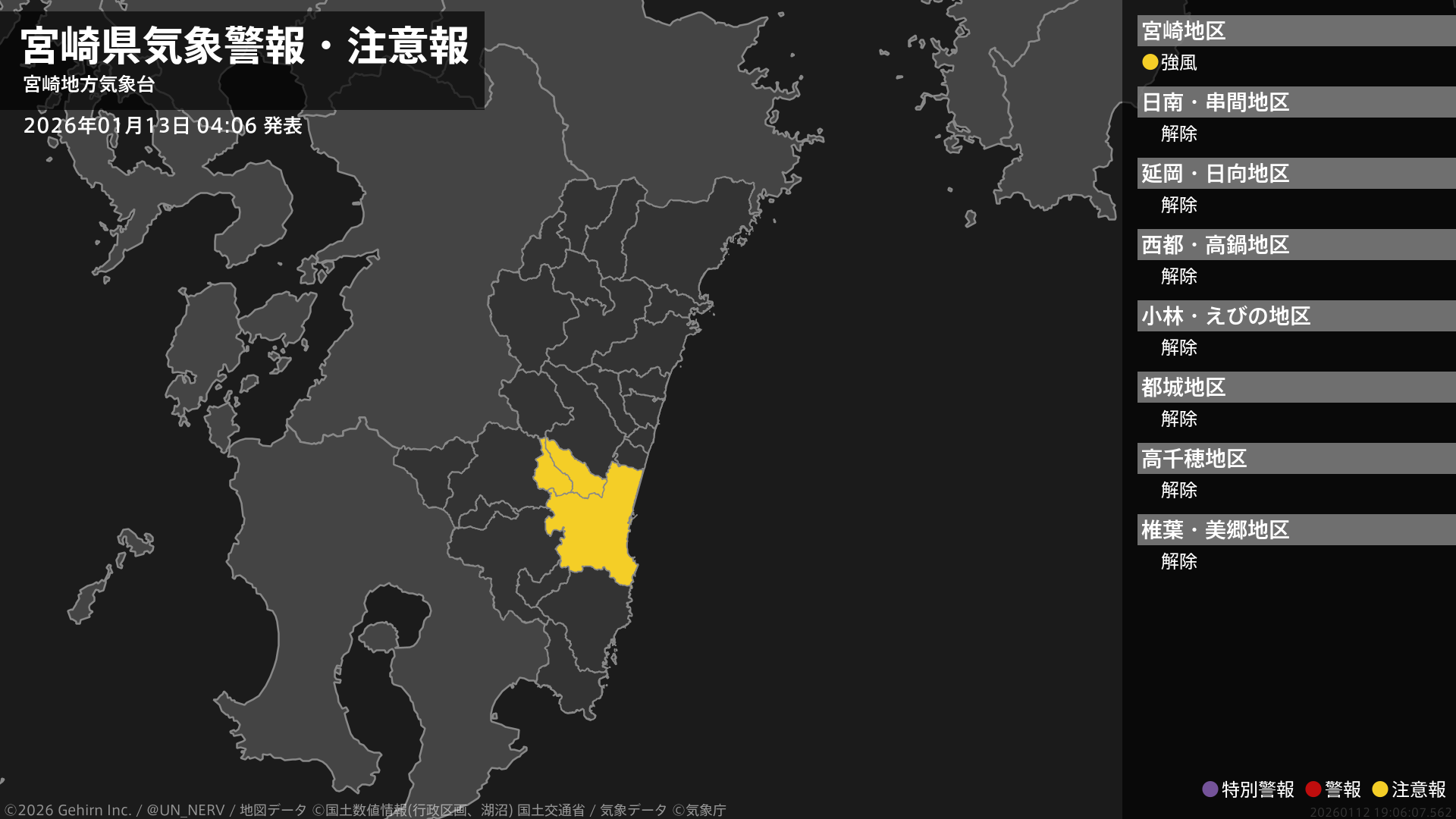 【宮崎県 気象警報・注意報 2026年01月13日 04:06】南部平野部では、13日昼前から13日昼過ぎまで強風に注意してください。#気象警報注意報 #宮崎県
