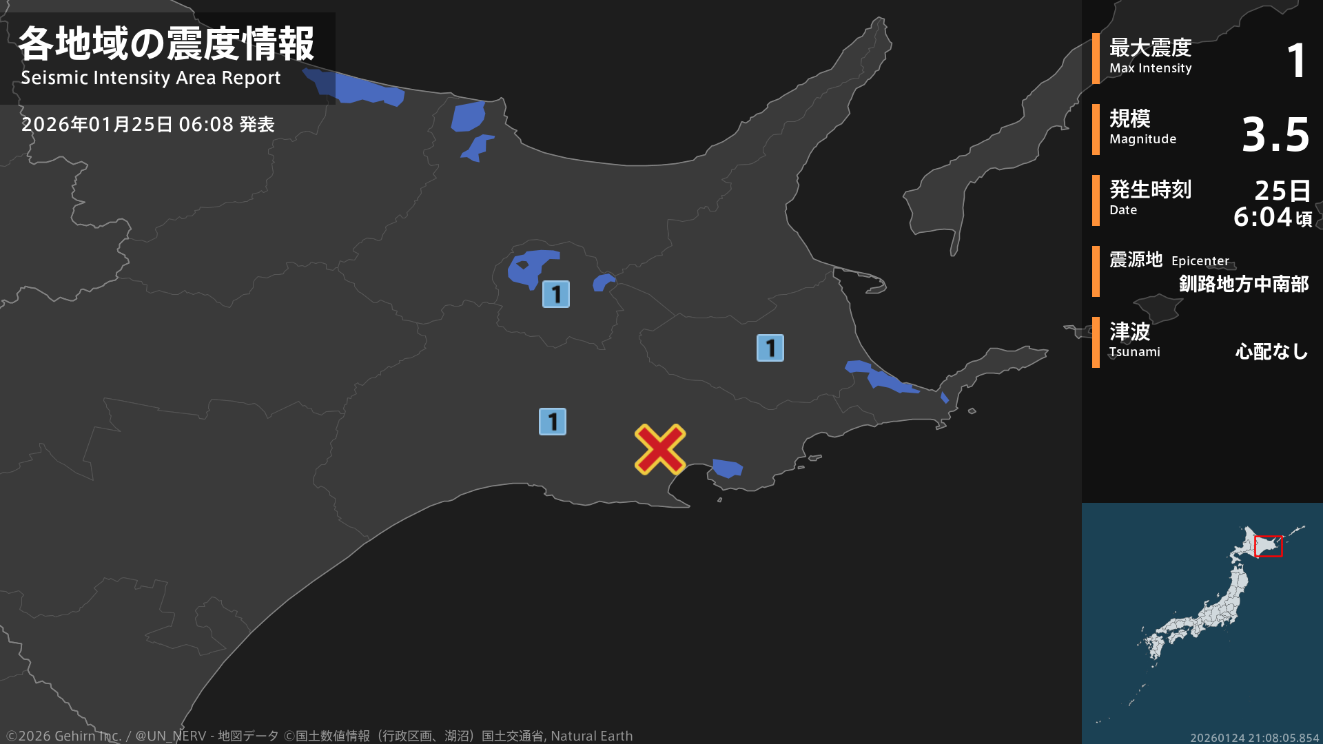 【地震情報 2026年1月25日】6時4分頃、釧路地方中南部を震源とする地震がありました。震源の深さは約70km、地震の規模はM3.5、最大震度1を北海道で観測しています。この地震による津波の心配はありません。#地震 #北海道