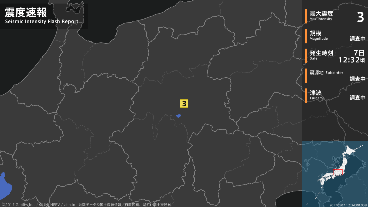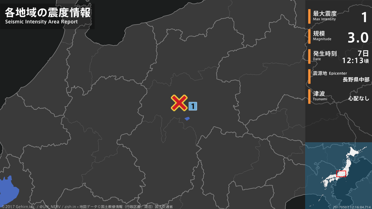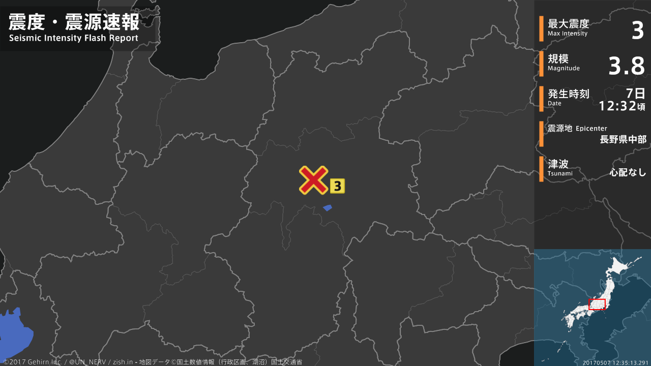7日12時32分頃、長野県中部を震源とする地震がありました。震源の深さは約10km、地震の規模はM3.8と推定されています。この地震による津波の心配はありません。