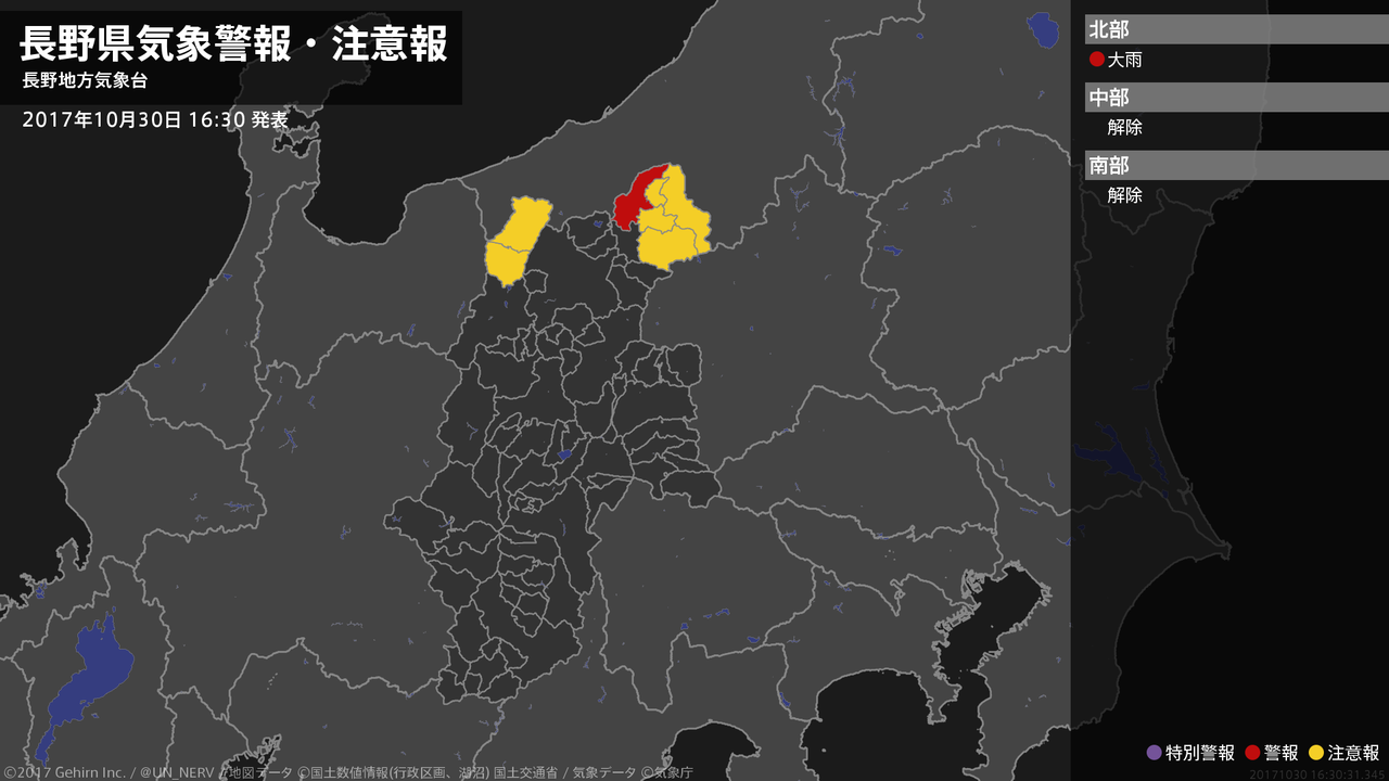 【長野県 気象警報・注意報 2017年10月30日 16:30】北部では、31日明け方まで土砂災害に警戒してください。#気象警報注意報 #長野県